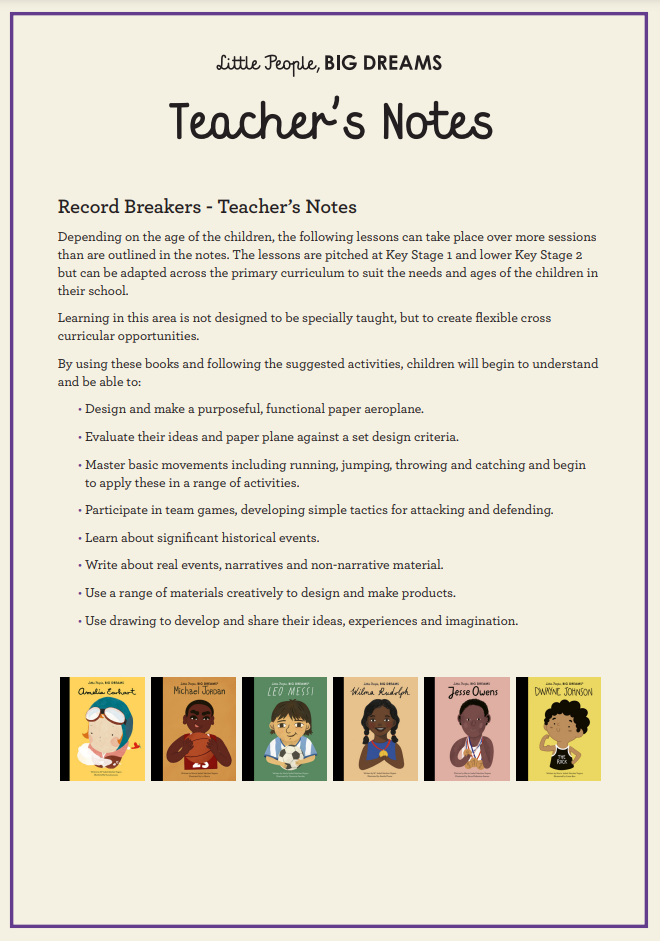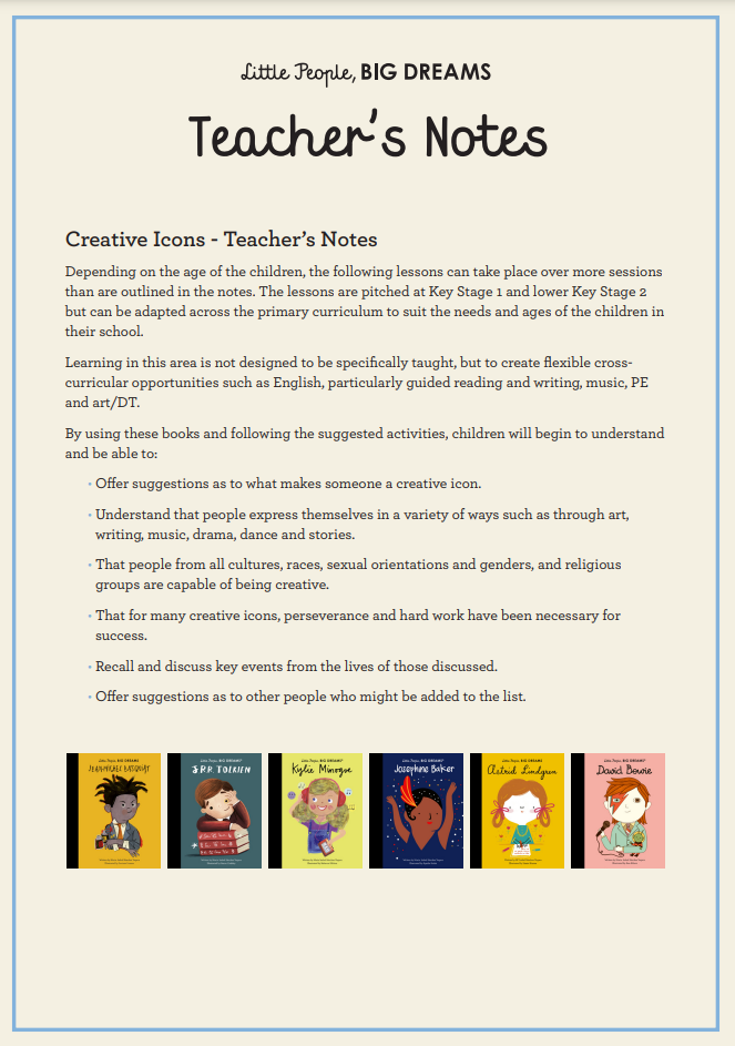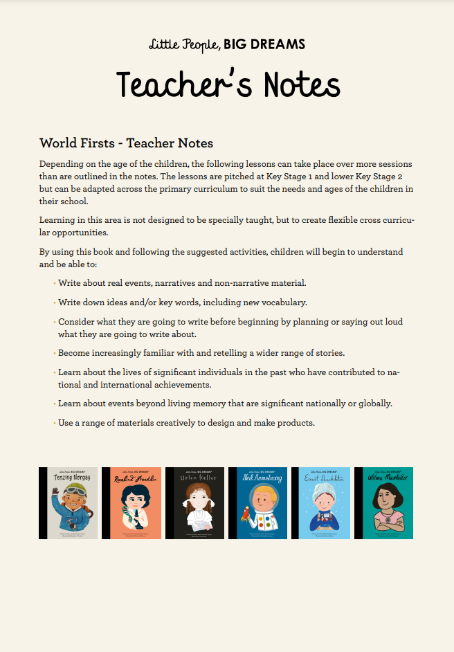 Download these Teacher's Notes to accompany your Little People Big Dreams book packs. The lessons are pitched at Key Stage 1 and lower Key Stage 2, but can be adapted across the primary curriculum to suit the needs and ages of the children in their school.